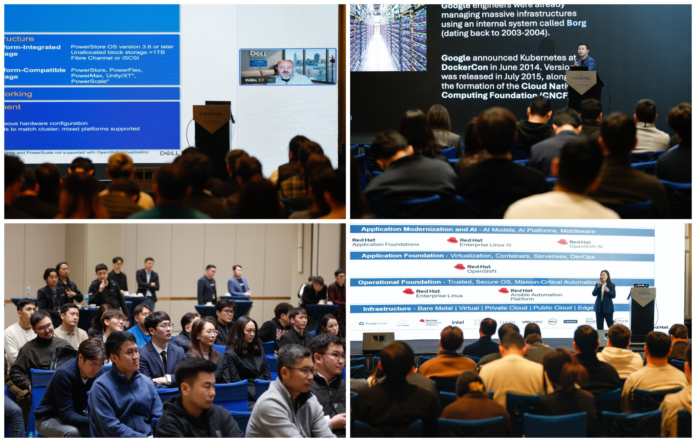 Түүнчлэн салбарын экспертүүд Dell Private Cloud for OpenShift шийдлийн боломжууд болон хэрэглээний давуу талуудыг танилцуулж, байгууллагууд container-д суурилсан аппликейшнуудыг илүү хурдан байршуулж, найдвартай ажиллуулах, мөн мэдээлэл технологийн дэд бүтцийг автоматжуулан удирдах боломжтой байдаг талаар онцолсон ба Red Hat OpenShift платформ нь энтерпрайз түвшний Kubernetes орчныг бүрдүүлэх, application lifecycle management-ийг автоматжуулах, орчин үеийн аппликейшн болон микросервис архитектурыг хэрэгжүүлэхэд чухал үүрэг гүйцэтгэдэг талаар дэлгэрэнгүй мэдээлэл хүргэсэн.